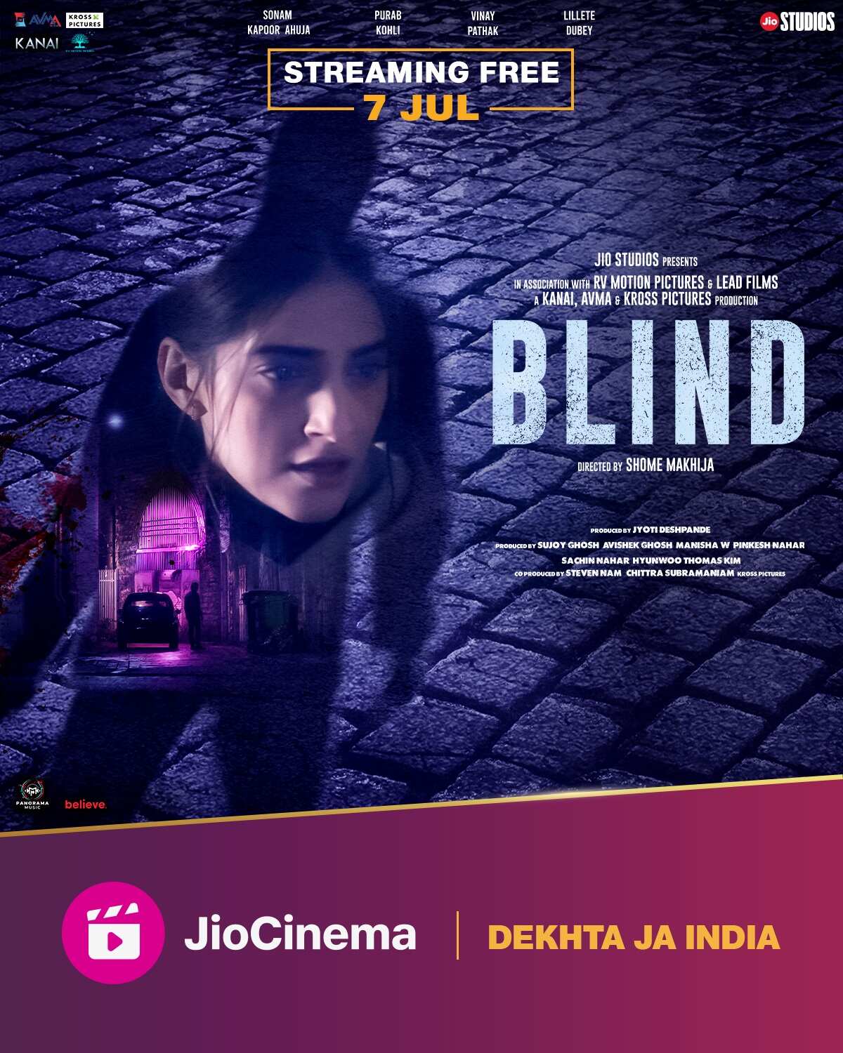 The world premiere of Blind will take place on July 7 and will only be available on JioCinema. Jio Studios presented the movie in collaboration with RV Motion Pictures and Lead Films after Kanai, Avma, and Kross Pictures produced it.